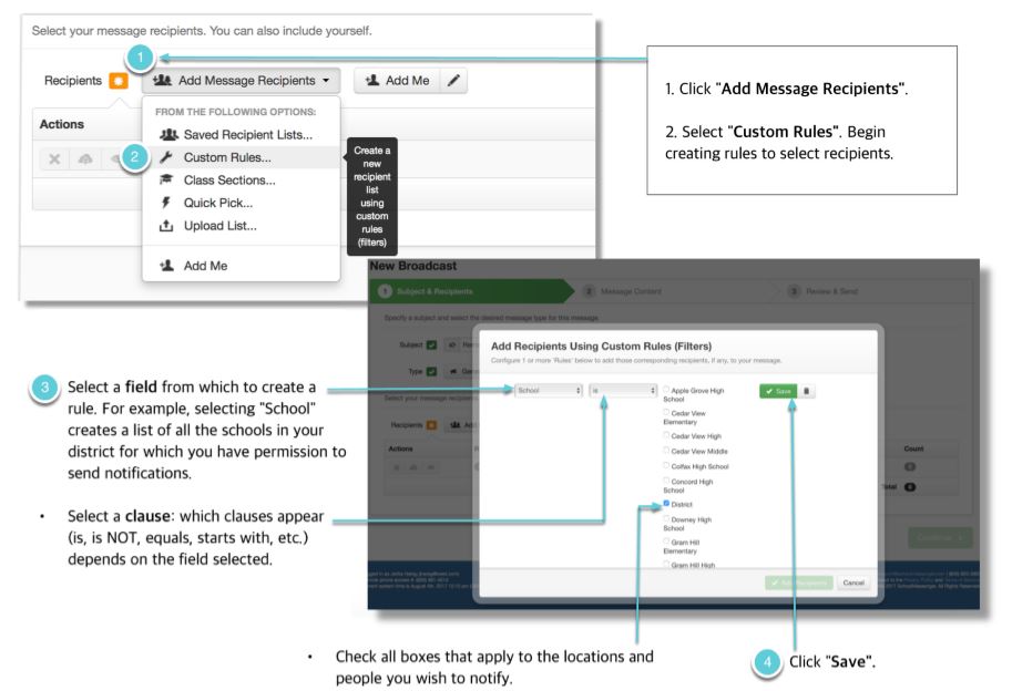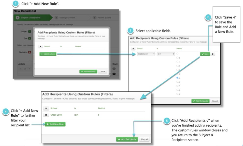 If the list of recipients you want to send a broadcast to hasn’t been previously created and saved, you can build a new one using Custom Rules (and save it for future use). Custom Rules allow you to filter and isolate specific groups of recipients from your student database files imported by your system administrator. Stack as many rules as you need to narrow down your contacts to be as specific as possible.