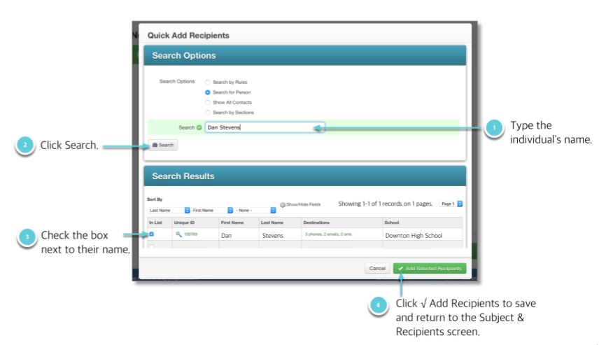 Build a simple list by searching for specific individuals and checking the box to the left of their record. You can search, narrow down the search using rules (just like in the Custom Rules option described above), pick from a list of all contacts, or search contacts by class section.