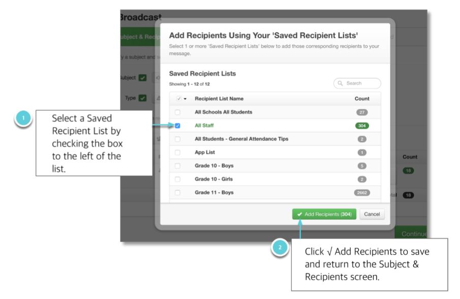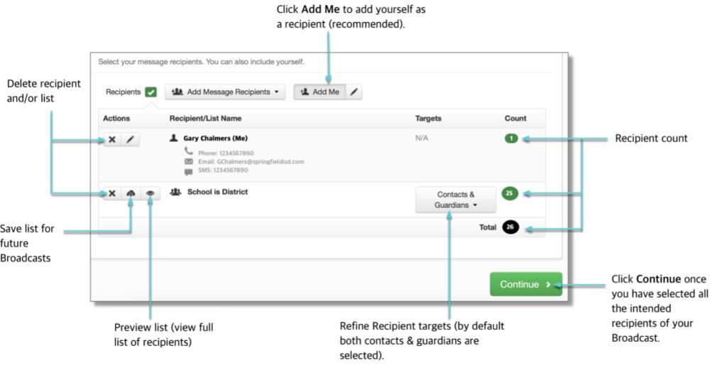 "Recipients" refers to the people to whom you are sending your broadcasts. This could be parents and guardians, students, staff or anyone who's information is included in one of your account's imports and your address book. You can even send your broadcasts to yourself (recommended).