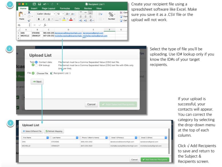 Uploading a list requires that you have a .CSV file of contacts saved on your computer. This advanced way of creating a list can be handy when the people to whom you need to broadcast may not be included in one of your account’s database imports. This option is covered in more detail in the Upload List section of this online Help.