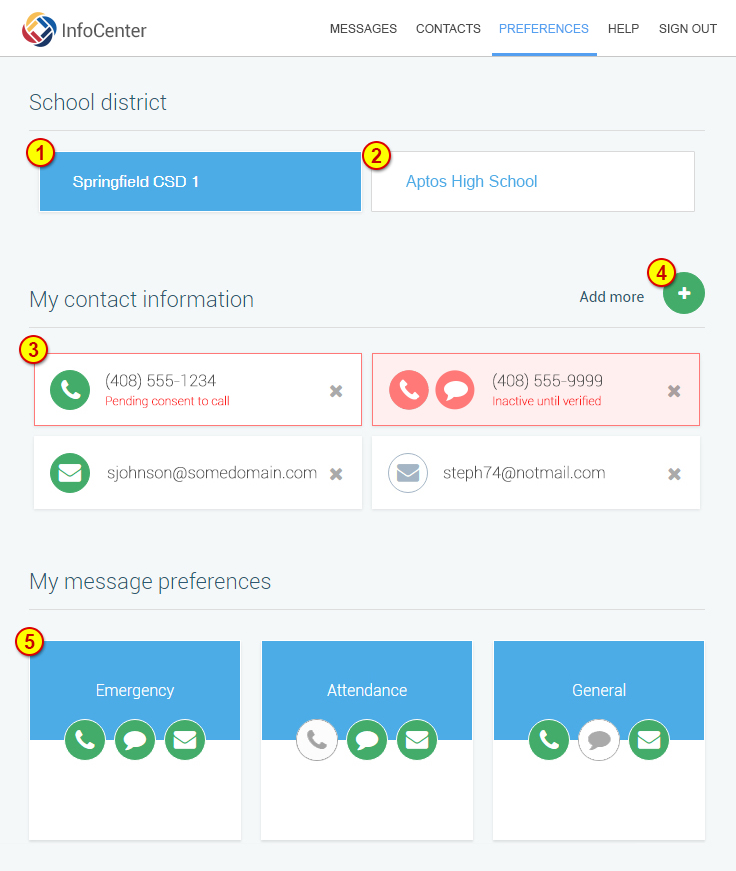 The InfoCenter Preferences page is divided into three sections: School/District, My contact information, and My message preferences.