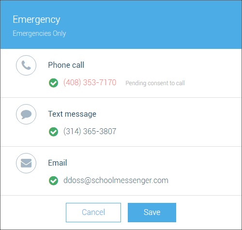 This section shows all of the available message types the school can send to the currently selected phone or email. A green check-mark next to "Call Me", "Email Me" or "Send Text" indicates you will receive that type of message from the school on this point of contact. Simply check or uncheck any messages to set yourself to be notified the way you prefer.